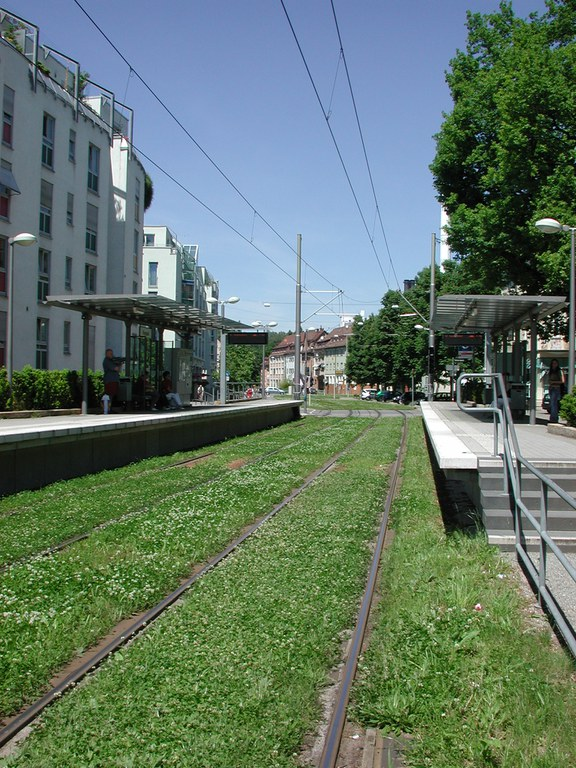 Stuttgart’s tram tracks as ventilation corridors for cooling the city. Photo by Climate Adapt - Shenzhen’s Sponge city transition has resulted in green roofs, raingardens and permeable pavement capable of capturing over 60% of annual rainfall in the Guangming New District. This is a low impact model for stormwater management, led by provincial and local governments, through China’s sponge city program, which provided the financial impetus and subsidies for implementation, along with non-profits, local community and private businesses as partners.