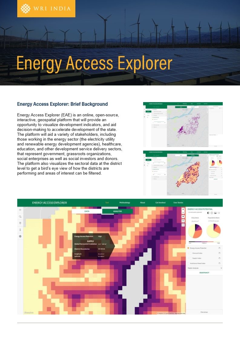 To help understand these links and to develop inferences from these datasets, WRI has developed the Energy Access Explorer (EAE) platform. It is an online, interactive platform that for the first-time ever, brings together geospatial data from development and electricity sectors to support decision making.
