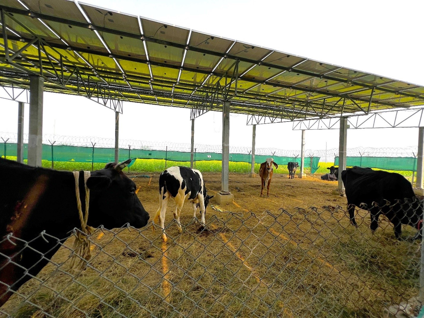 Additionally, the Issapur agrivoltaic plant houses a herd of 8-10 cattle that are reared in a dedicated space, under the solar panels, where they can graze. This practice, known as solar grazing, allows farmers to diversify their income while also generating renewable power.