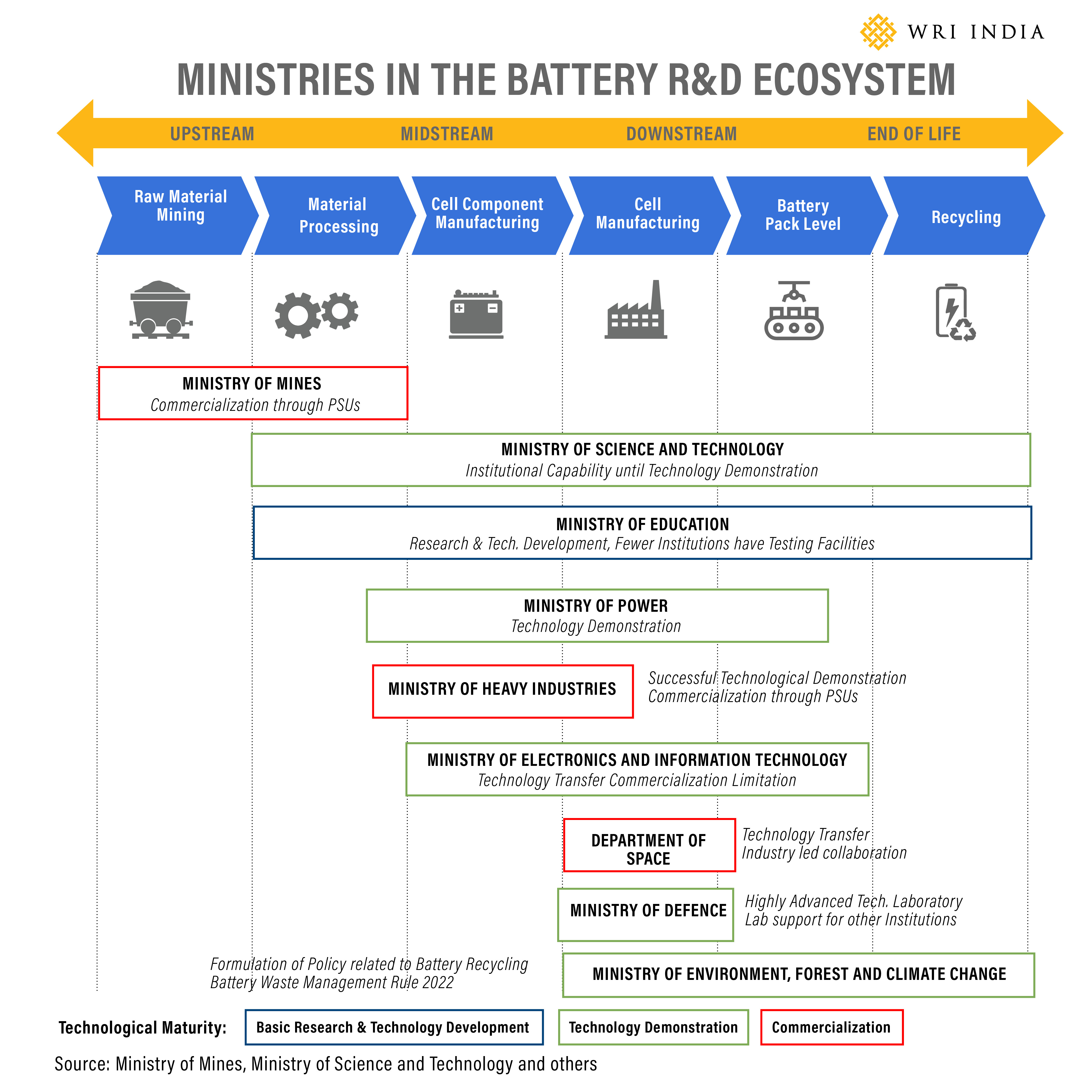 Government Sector: Research institutions, laboratories and public sector undertakings (PSUs) under various ministries are working on various aspects of the battery supply chain and its technological development - from raw material extraction and processing to cell manufacturing and recycling (as shown in figure 3).