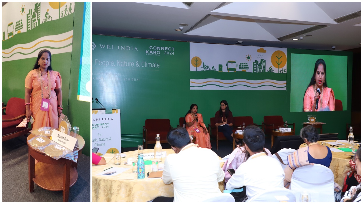 Mamta Devi, 30, deftly passes her handbag to her waiting husband as she discusses expanding her venture, Didi Ke Papad, with me. She was participating in the ‘Solution Room: Enhancing Women’s Workforce Participation in Greener MSME Jobs’ session at WRI India’s flagship event, Connect Karo 2024, in New Delhi.