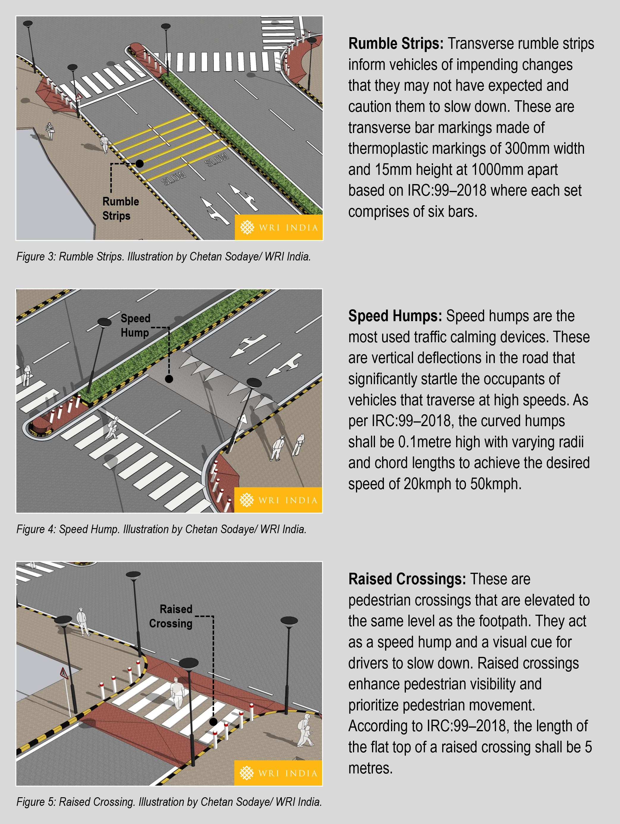 Speed calming measures are designed to reduce vehicle speeds, thereby decreasing conflicts and the risk of crashes. There are multiple ways of curbing speeding using horizontal and vertical traffic calming devices such as lane narrowing, curb extensions, chicanes, rumble strips, speed humps, raised crossings, raised intersections, etc. Among these, vertical shifts in the carriageway such as rumble strips, speed humps and raised crossings, when implemented strategically, help maintain traffic flow and deter drivers from driving at higher speeds.