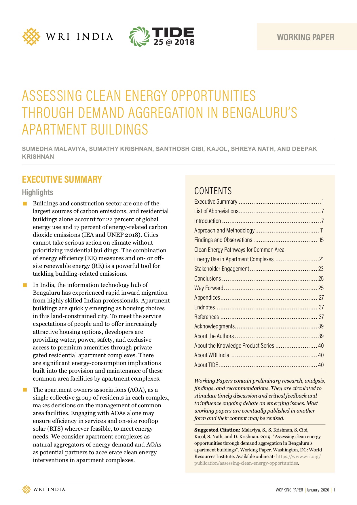 This working paper co-authored by WRI India and TIDE describes the findings from examining demand aggregation potential in ten apartment complexes in Bengaluru. We define demand aggregation as the act of grouping together multiple residents in an apartment complex as a single consumer of the services provided in a common area. The study found that there was significant potential to save energy in common services in apartment buildings and use solar energy to meet most needs. Apartment Owners Associations (AOAs) that manage common services can be the anchors for implementing these clean energy measures in apartment complexes.