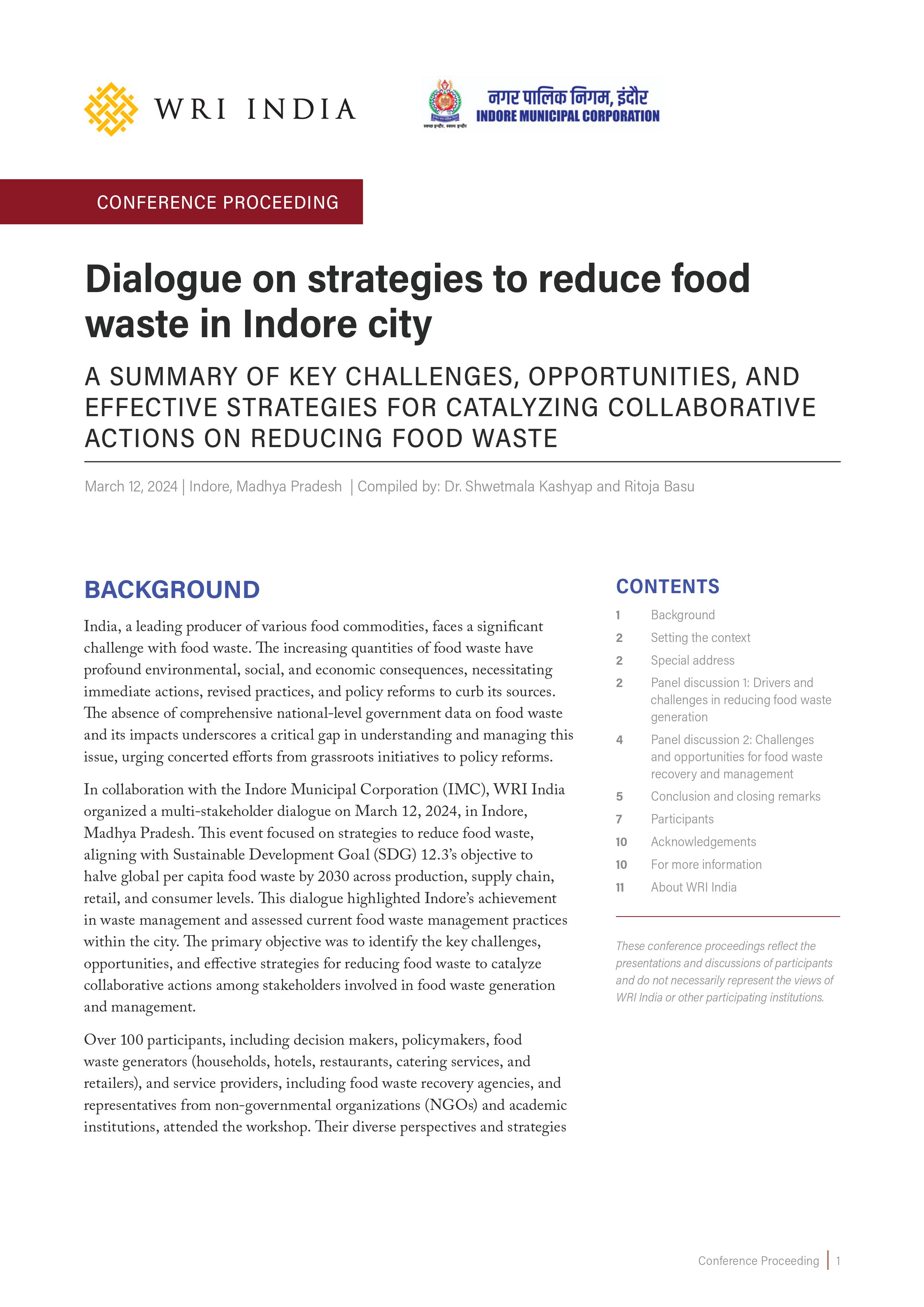 WRI India organized a multi-stakeholder dialogue in collaboration with the Indore Municipal Corporation to focus on strategies that can reduce food waste, aligning with Sustainable Development Goal (SDG) 12.3’s objective to halve global per capita food waste by 2030 across production, supply chain, retail, and consumer levels. This dialogue highlighted Indore’s achievement in waste management and assessed current food waste management practices within the city along with the key challenges, opportunities, and effective strategies to catalyze collaborative actions among stakeholders involved in food waste generation and management. This conference proceedings present insights from this dialogue based on the diverse perspectives and inputs shared by over 100 participants, including decision makers, policymakers, food waste generators (households, hotels, restaurants, catering services, and retailers), and service providers, including food waste recovery agencies, and representatives from non-governmental organizations and academic institutions.