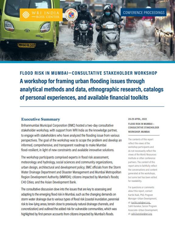 BMC in collaboration with WRI India as knowledge partner conducted a two-day consultative workshop on Flood Risk in Mumbai in April 2022. Government representatives from various departments: hydrological, engineering, and stormwater management discussed the complexities of managing monsoon floods in Mumbai, with flood modelling experts, social scientists, urban planners and designers, community organizations, and impacted citizens. WRI India developed this summary note from the workshop discussions which includes highlights from panels on technical considerations, climate vulnerability, citizen impact stories, infrastructure interventions, financing, and government initiatives.