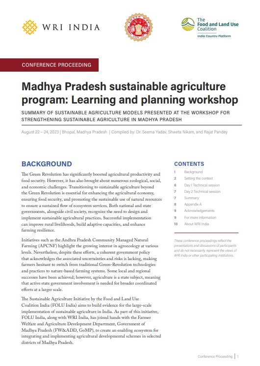 The Learning and Planning Workshop, co-organized by the FW&ADD, GoMP, FOLU India, and WRI India under the Madhya Pradesh Sustainable Agriculture Program: Synergizing Policies and Actions, aimed to understand successful sustainable agriculture models across India and discuss their adaptation in Madhya Pradesh. The workshop saw presentations by 16 organizations, including civil society organizations (CSOs) and private sector entities, with attendance from approximately 140 government officials and team members from WRI India and FOLU India. This conference proceeding summarizes the discussions held during the three-day workshop on agri-value chain components, knowledge support, production landscape, technology innovation, financing models, governance, and water conservation.