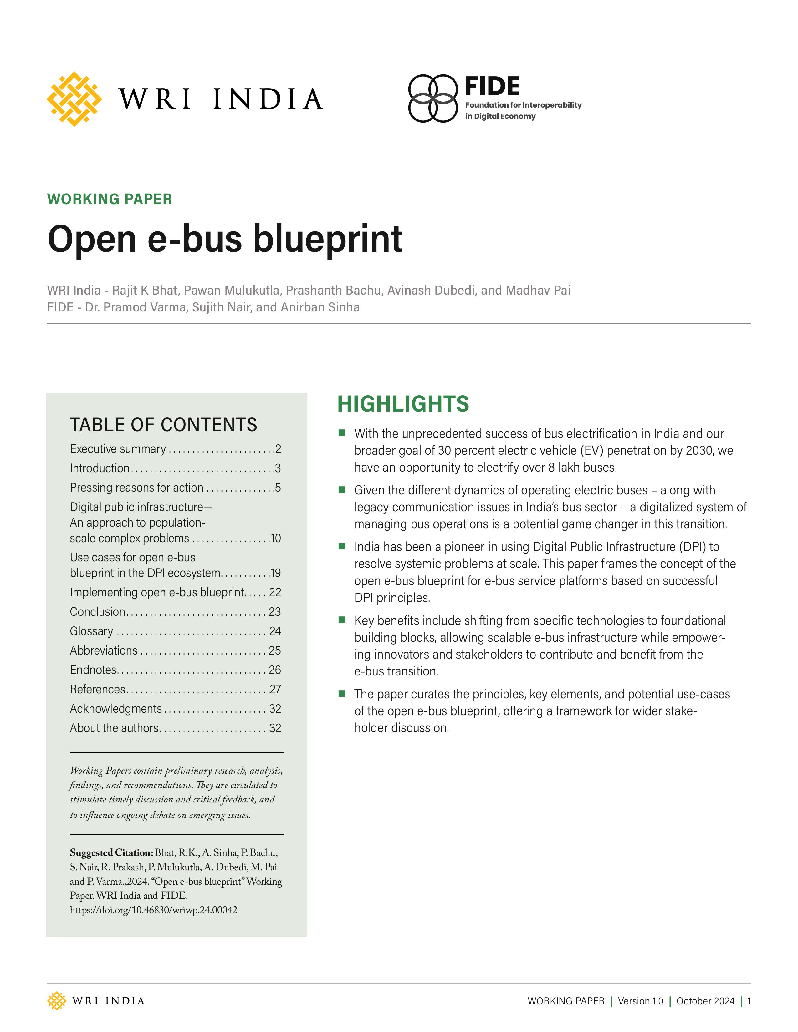 In this working paper, WRI India and Foundation for Interoperability in Digital Economy (FIDE) seek to frame and contextualize the challenges the bus transport system will confront amid the complexities of a large-scale digital transition. The paper proposes a novel approach that leverages Digital Public Infrastructure (DPI) principles to guide bus electrification and a roadmap for translating this blueprint into reality.