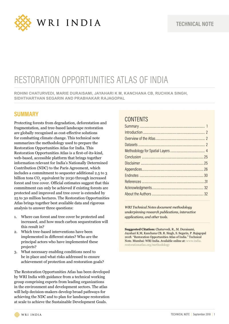 Protecting forests from degradation, deforestation and fragmentation, and tree-based landscape restoration are globally recognized as cost-effective solutions for combatting climate change. As part of the Nationally Determined Contribution (NDC) under the Paris climate agreement, India committed to sequester additional 2.5 to 3 billion tons CO2 equivalent by 2030. The Restoration Opportunities Atlas brings together best available data and rigorous analysis relevant to India’s NDC. The Atlas will be useful for decision-makers in national and state governments, funding agencies, restoration practitioners, researchers and academics as well as private and civil society organizations committed to climate action in India.